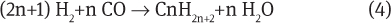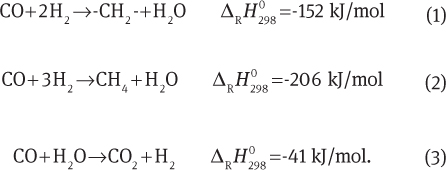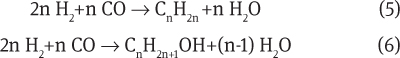 Equations 1 and 2 describe the formation of hydrocarbons and methane, respectively. The main reaction is the formation of alkanes (CnH2n+2):