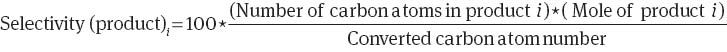 The selectivity to C5+ hydrocarbons was calculated from the carbon balance of the reactions.