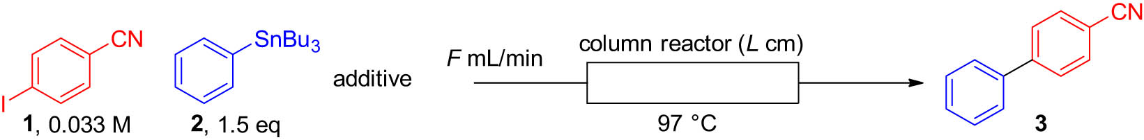 Having confirmed the good tolerance of our immobilized palladium catalyst, we attempted to utilize it under flow conditions. We chose Stille coupling for demonstration purposes (Table 2). First, we applied the previous Suzuki coupling condition [26] to the flow Stille coupling using a co-solvent of methanol and tetrahydrofuran (THF) at 97°C. When tetra-n-butylammonium fluoride (TBAF) was used as an additive (Table 2, entry 1), the reaction yield was low. The reaction without the additive did not significantly change the result (entry 2), indicating that TBAF is not suitable for this reaction. Thus, we decided to use lithium chloride as an additive. As LiCl is not soluble in THF, we changed the co-solvent to methanol with DMSO. The use of LiCl increased the product yield (entry 3). By contrast, the reaction in MeOH/DMSO without the additive resulted in a dismal yield (entry 4), indicating that the addition of LiCl was crucial for this Stille coupling, presumably because the acceleration of the transmetallation step varies according to the strength of the Stannane–halogen bond