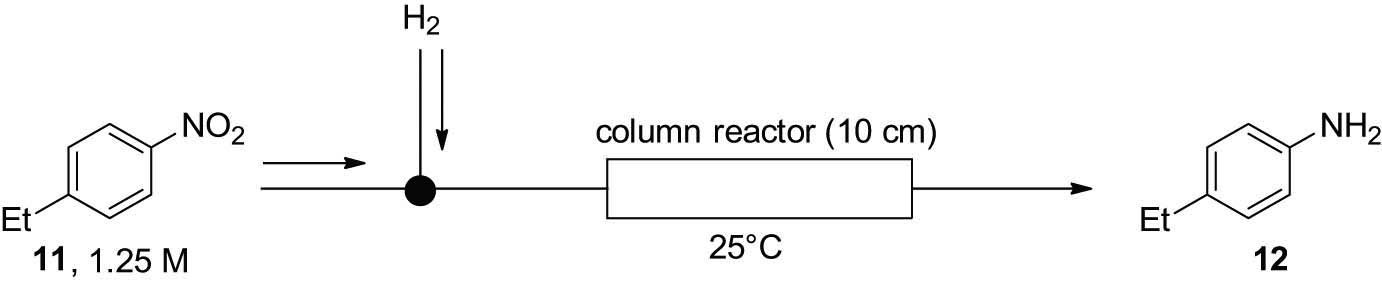 A methanol solution containing 1-ethyl-4-nitrobenzene (11, 1.25 M) was introduced into the column reactor using a plunger pump. In addition, hydrogen gas was introduced using a mass flow controller. The column reactor was dipped in a water bath to maintain its temperature at 25°C. After it had reached a steady state, the solution was collected for 10 min. The solution was analyzed by GC to determine the yield of the desired product 12.