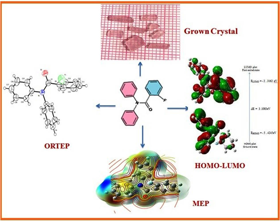 In this point of view, the present work is designed to synthesis 2-fluoro-N,N-diphenylbenzamide (2FNNDPBA) and to develop as single crystals. 2FNNDPBA is an intriguing compound, aryl tertiary amide, whose synthetic construction is profoundly delocalized π-electron framework in which fluorine is substituted in the benzene ring. The developed single crystals will be described for their NLO applications. Their trademark studies, for example, primary, otherworldly, optical, and thermal are to be completed and the outcomes are accounted for [17]. Experiments and theoretical investigations will be conducted to afford a complete depiction of the molecular structure, first-order hyperpolarizability, Mulliken atomic charges, highest occupied molecular orbital (HOMO)–lowest-lying unoccupied molecular orbital (LUMO) analysis, and molecular electrostatic potential (MEP), among other things.