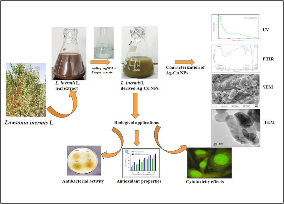 The study aimed to synthesize for the first time bimetallic (Ag–Cu) nanoparticles using L. inermis leaf extract. The resulting Ag–Cu NPs were characterized by various methods (ultra–visible spectroscopy [UV–Vis], Fourier transform infrared spectroscopy [FTIR], X-ray diffractometer [XRD], field emission scanning electron microscopy [FESEM], and transmission electron microscopy [TEM]), and the antioxidant, antibacterial, and antiproliferative activities were assessed. Furthermore, the biotoxicity was determined. In ecotoxicological studies that screen several metabolites for drug detection in plants, the A. nauplii assay is routinely used [34]. Artemia-based assays are considered quick, convenient, and affordable.