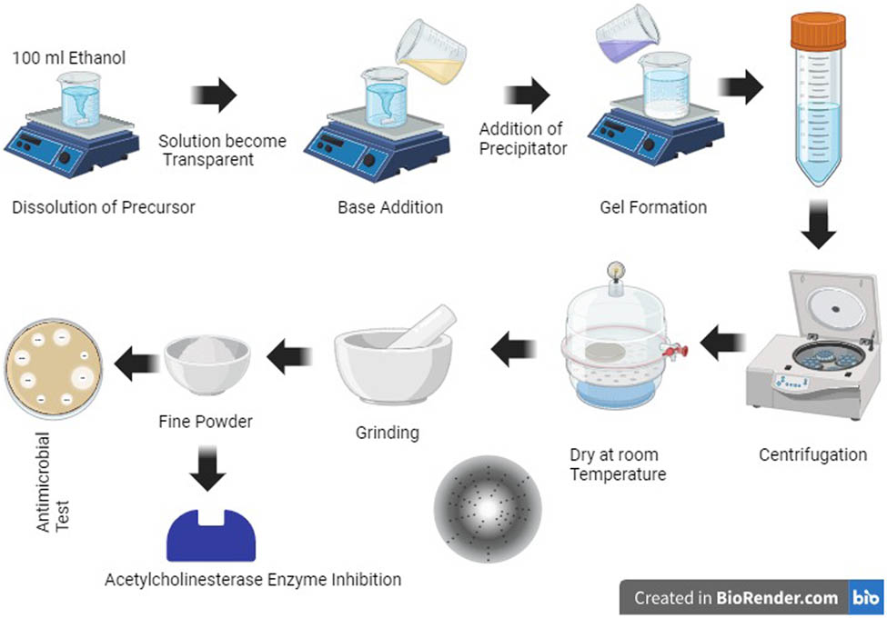The non-toxic nature of ZnO NPs has opened new avenues for biomedical applications, including their use as drug carriers, biosensing materials, and photocatalysts. ZnO NPs are effective in removing contaminants from wastewater and exhibit strong antibacterial properties, making them useful in medical applications. They are also valuable in environmental remediation by breaking down harmful chemicals through photocatalysis. Doping ZnO NPs with manganese (Mn), cobalt (Co), and aluminum (Al) enhances their photocatalytic efficiency, stability, and antibacterial properties, making them highly effective in advanced water treatment and pollutant degradation [22,23,24,25,26,27,28,29,30,31,32,33,34,35]. Increasing antibiotic resistance and Alzheimer’s disease (AD) are two significant healthcare challenges. The misuse of antibiotics strengthens bacterial resistance, leading to prolonged antibiotic use and increased mortality rates [36,37,38]. Fifty-five million people are living with AD and other dementia, and this might increase to two billion by 2,050, as reported by the World Health Organization (WHO) and Alzheimer’s Disease International (ADI) [39]. AD is a neurodegenerative disorder characterized by memory loss with no effective treatment to date. In Alzheimer’s patients, AChE activity is abnormally increased, further exacerbating the decline in acetylcholine levels. Biocompatible, environmentally friendly, cost-effective, and non-toxic metal, metal oxide, and metal peroxide NPs have the potential to combat microbes and AD [40,41,42,43,44,45,46].