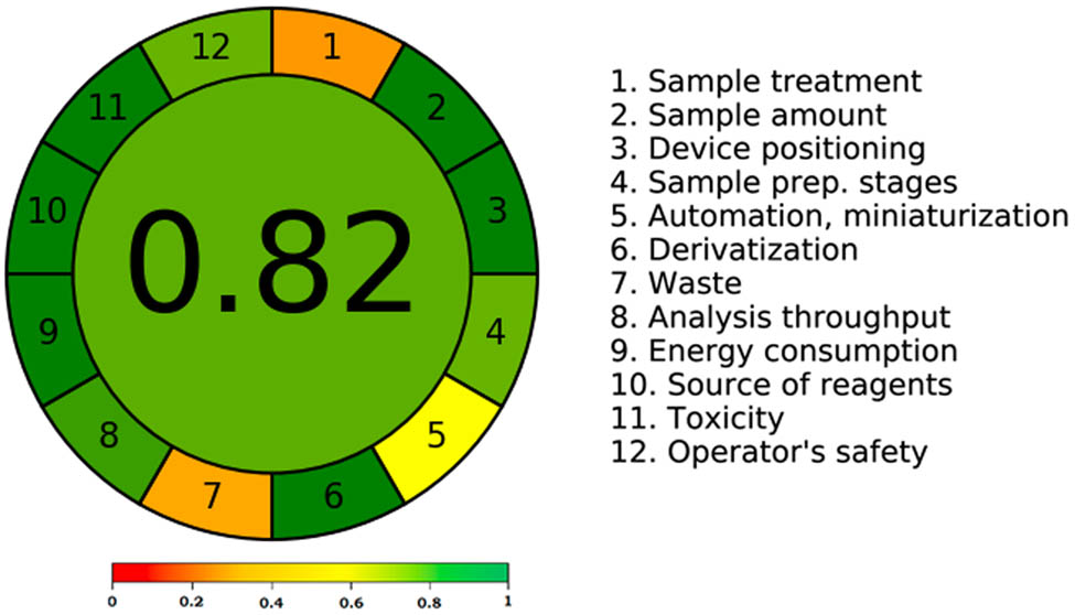 Three distinct tools were used in this work to derive the greenness scale of the current analytical approach: the AGREE [30], ChlorTox [29], and AES [25]. AES is a semi-quantitative approach that considers waste, instruments, and every step of the analytical process. Reagent usage, energy consumption, and waste are all anticipated to be negligible or absent in materials with an optimum analysis of 100 points. If any of these guidelines are broken, penalty points are given and subtracted from the total of 100 [25]. The ChlorTox scale was determined with the help of Eq. 1 as per the ChlorTox approach [29]: