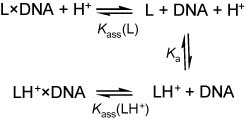 =c(L×DNA)c(H+)/c(LH+×DNA)=Ka×[Kass(L)/Kass(LH+)].