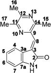 A solution of 3,5,6-trimethylpyrazine-2-carbaldehyde (4) (40 mg, 0.26 mmol), 2-oxindole (35 mg, 0.26 mmol) and piperidine (0.02 mL) in EtOH (3 mL) was heated to reflux for 3 h. Upon cooling to room temperature, the mixture was concentrated in vacuo, diluted in ethyl acetate (30 mL), washed with brine (20 mL), dried (Na2SO4), filtered and concentrated in vacuo. The crude solid was purified by flash chromatography on silica gel (30:70 EtOAc/CH2Cl2) to yield compound 1 (18 mg, 0.07 mmol, 45%) as an orange solid; mp 255–257°C (lit [3] mp not stated); IR (neat): νmax 3300, 1701, 1605, 1460, 1405, 1362, 1321, 747 cm-1; For NMR data, see Table 1. ESI-HRMS. Calcd for [C16H15N3O + Na]+: m/z 288.1113. Found: m/z 288.1114.