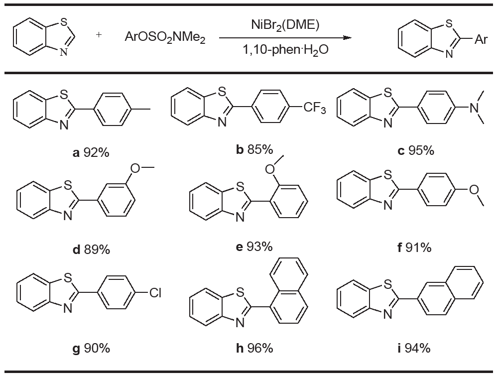 a) Reaction conditions: benzothiazoles (0.1 mmol ), ArOSO2NMe2 (0.1 mmol ), tBuOLi(0.2 mmol ),1,10-phen⋅H2O(0.04 mmol ), NiBr2(DME)(0.04 mmol ), dioxane (3 ml), 120 oC, N2 atmosphere. b) Isolated yields.