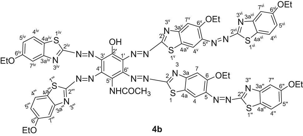 Compound 4b was obtained in 47% yield as red powder; m.p. 197–199°C (dec); 1H-NMR (DMSO-d 6, 400 MHz): δ 8.11 (d, 1H, J = 2.8, H-4iv), 8.00 (s, 1H, H-7), 8.02 (s, 1H, H-7v), 7.91 (d, 1H, J = 9.2, H-4″′), 7.71 (d, 1H, J = 2.0, H-7″′), 7.68 (d, 1H, J = 3.6, H-7″), 7.65 (d, 2H, J = 8.8, H-4″ and H-4vi), 7.62 (d, 1H, J = 6.4, H-7vi), 7.61 (s, 1H, H-4v), 7.58 (s, 1H, H-4), 7.16 (dd, 2H, J = 9.2 and 2.8, H-5″′ and H-5iv), 7.15 (d, 1H, J = 2.4, H-7iv), 7.09 (d, 2H, J = 8.8, H-5″ and H-5vi), 4.18, 4.16, 4.14, 4.12, 4.11, 4.10, 4.08 (OCH 2 CH3); 1.58, 1.40, 1.38, 1.36, 1.35 (OCH2 CH 3 ); 2.05 (s, 3H, COCH3); 13C-NMR (DMSO-d 6, 100 MHz): δ (see Table 1); UV-Vis λ max (DMSO) (log ε): 211 (4.45), 214 (4.47), 229 (4.51), 238 (4.51), 258 (4.53), 2.69 (4.65), 279 (4.57), 309 (4.54), 364 (4.58), 378 (4.56), 416 (4.62) nm; IR (KBr) ν max: 3,281 (O–H), 2,980–2,933 (ArC–H), 1,657 (C═O), 1,599 (C═N), 1,556 (C═C), 1,488–1,456 (N═N), 1,263 (C–S), 1,211 (C–O), 899–519 (Ar def C═N str thiazole) cm−1; ms: (ESI+) m/z (%) 1,492 (9), 1,453 (9), 1,428 (17), 1,404 (17), 1,379 (15), 1,353 (18), 1,323 (16), 1,293 (11), 1,238 (17), 955 (32), 728 (69), 659 (71), 549 (72), 486 (52); anal. calcd for C62H63N19O14S6: C, 49.96; H, 4.26; N, 17.85; S, 12.90. Found: C, 49.98; H, 4.28; N, 17.81; S, 12.88. Rf = 0.39.