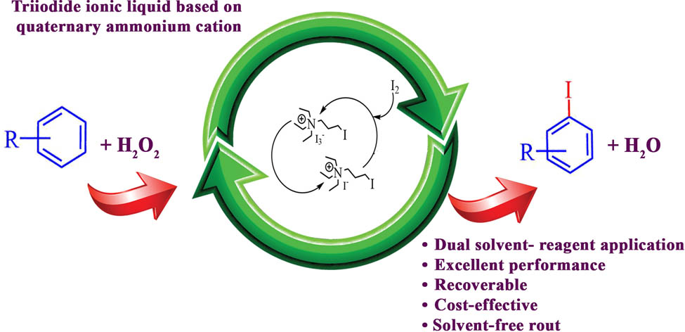 According to the goals of green chemistry and its approach to using green solvents and compounds to reduce environmental pollution, this article presents a significant and mild method for iodination reaction utilizing ionic liquid 2 based on quaternary ammonium cation as a novel reagent and reaction medium. Based on data from the literature, we have, for the first time, reported a recoverable and inexpensive triiodide ionic liquid, and it is the first example that triiodide RTIL was used both as the green solvent and as a reagent in combination with H2O2 (35%) to produce corresponding iodo derivatives. The iodination was performed without the presence of any organic solvent, and water was the only extraction solvent. At the end of the reaction, the consumed reagent N,N,N-triethyl-3-iodopropan-1-aminium iodide was easily recycled.