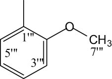 Off-white solid; yield: 85%; m.p.: 146–148°C; HRMS: [M]•+ 516.6338 (calcd for C24H28N4O5S2; 516.6347; Anal. Calcd for C24H28N4O5S2:C, 55.80; H, 5.46; N, 10.84; O, 15.48; S, 12.41; found C, 55.78; H, 5.43; N, 10.80; O, 15.43; S, 12.38; IR (KBr, υ max, cm−1): 3,355 (N–H), 3,066 (C–H stretching of aromatic ring), 1,681 (C═N stretching), 1,659 (C═O), 1,586 (Ar C═C), 1,429 (S═O), 1,067 (C–N), 601 (C–S); 1H-NMR (600 MHz, CDCl3, δ/ppm): 7.82 (d, J = 8.0 Hz, 1H, H-6‴), 7.71 (d, J = 8.9 Hz, 2H, H-6″ and H-2″), 7.27 (t, J = 7.4 Hz, 1H, H-5‴), 7.22 (d, J = 7.4 Hz, 1H, H-3‴), 7.06 (t, 8.5 Hz, 1H, H-4‴) 7.01 (d, J = 8.9 Hz, 2H, H-3″ and H-5″), 6.75 (s, 1H, H-4‴), 3.88 (s, 3H, H-7″), 3.98–3.96 (m, 1H, He-2′), 3.68–3.66 (m, 1H, Ha-2′), 3.64 (q, J = 6.8 Hz, 2H, H-2″″), 3.15–3.12 (m, 1H, H-3′), 2.66–2.63 (m, 1H, He-6′), 2.47–2.36 (m, 1H, Ha-6′), 2.15–2.12 (m, 1H, Ha-5′), 2.11 (s, 3H, H-7‴), 1.93–1.89 (m, 1H, Ha-4′), 1.77–1.75 (m, 1H, He-5′), 1.63–1.61 (m, 1H, He-4′), 1.42 (d, J = 6.8 Hz, 3H, H-3″″); 13C-NMR (150 MHz, CDCl3, δ/ppm): 163.17 (C-1″″, amidic), 160.16 (C-5, heterocyclic), 160.89 (C-2, heterocyclic),159.37 (C-4″, aromatic), 139.53 (C-3‴, aromatic), 136.80 (C-1‴, aromatic), 132.11 (C-1″, aromatic), 129.74 (C-2″ and C-6″, aromatic), 129.25 (C-5‴, aromatic), 124.71 (C-4‴, aromatic), 118.92 (C-2‴, aromatic), 115.31 (C-6‴, aromatic), 114.38 (C-3″ and C-5″, aromatic), 55.64 (C-7″, methoxy), 48.45 (C-2′, aliphatic, heterocyclic), 46.26 (C-6′, aliphatic, heterocyclic), 30.92 (C-4′, aliphatic, heterocyclic), 33.47 (C-2″″, amidic), 27.01 (C-3′, aliphatic, heterocyclic), 23.63 (C-5′, aliphatic, heterocyclic), 21.52 (C-7‴, aliphatic), 18.42 (C-3″″, amidic).