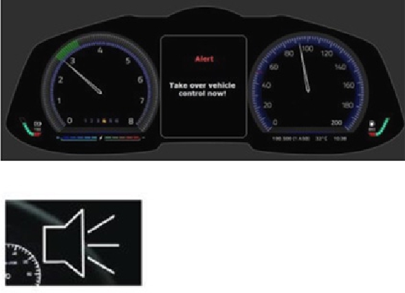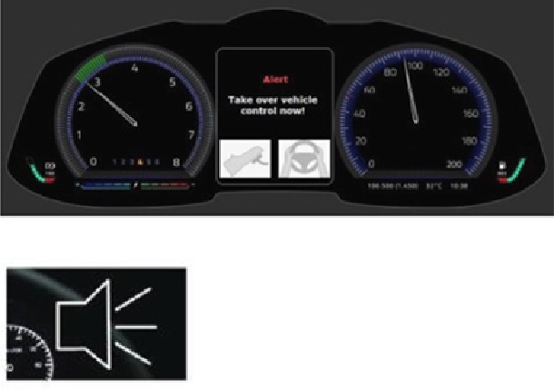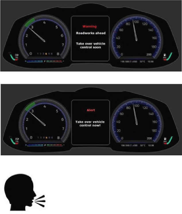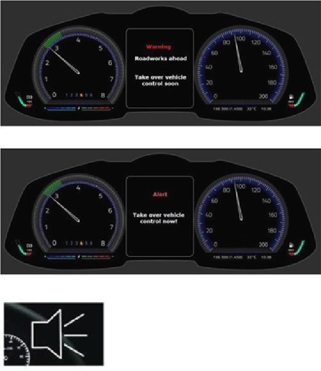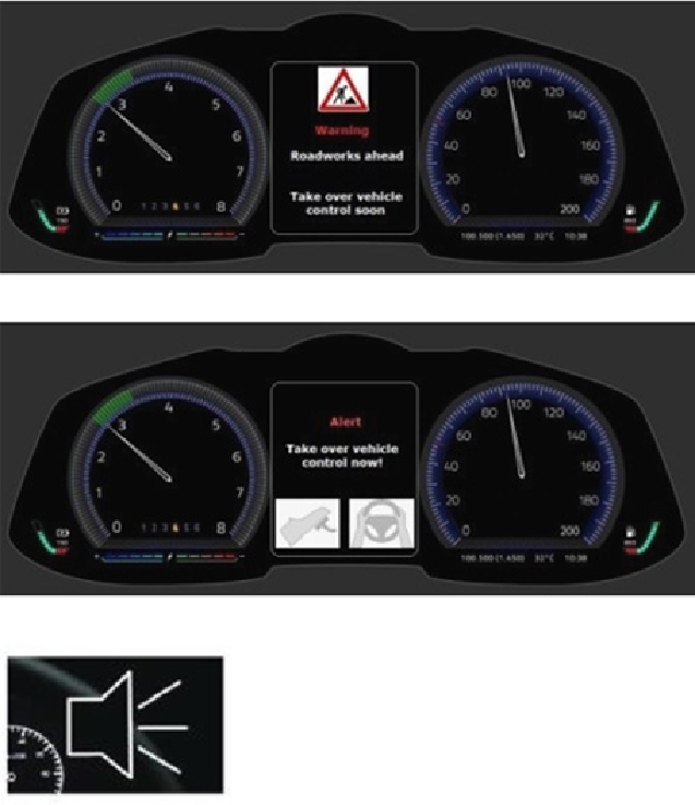 1. Note. The loudspeaker symbolises a simple beep tone; the talking head visualises speech output of the warning “Roadworks ahead! Take-over vehicle control soon” and/or the alert “Take-over vehicle control now” if applicable.