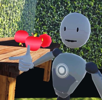 We used HTC VIVE and HTC VIVE Pro head-mounted displays (HMDs) and recently also the Oculus (Meta) Quest 2, a stand-alone HMD that does not require external tracking stations, like other mass-market and console-based solutions. VR devices allow users to immerse themselves in virtual environments through stereoscopy, motion, and hand tracking [26]. We did not yet use further early-stage hardware additions, like body, finger, eye, or face tracking, which exist for the VIVE platform but plan to integrate them eventually, as they might increase the immersive user experience and open up new possibilities for analysing behaviour. Social VR apps gather spatially separated people in a joint virtual environment. Users are represented by avatars and experience the virtual surroundings from the ego perspective. Although there are already some social VR platforms (e. g. AltspaceVR, VRChat, Rec Room), VR learning spaces that specifically evoke linguistic phenomena and boost holistic language learning for freely interacting tandem teams do not yet exist. With Hololingo!, we created a first didactically designed DGBLL environment for SVR. Based on a user-centred design approach, first iterations of the Hololingo! world have been developed using Unity, the VRChat SDK (Software Development Kit) and the HTC VIVE (Pro) HMDs. Unity is a cross-platform manufacturer-independent game engine, while the VRChat SDK provides basic methods for building social rooms with body and movement synchronisation as well as voice chat, which is crucial to support language learning. In our experience, developing a world with moderate interaction capabilities was straightforward, and low coding experience is required, but developers should be comfortable using the Unity engine. The VRChat SDK provides a range of triggers and actions to implement interaction. We added functions like pressing buttons and interacting with objects by grabbing or pulling on them to perform, for example, an exit-room coordination task in which users had to synchronise verbally on the simultaneous operation of two distant levers to unlock a door (Figure 3, middle). We integrated videos to introduce the tandem method and as conversation starters. For complex interactions, like spelling a word by dropping apples on lettered floor tiles (Figure 3, left), we used animations and triggers from Unity and actions provided by VRChat. We also developed gaming elements like escaping from Huckup in a maze – a Pacman scenario where users must verbally coordinate for navigation and warnings (Figure 3, right).