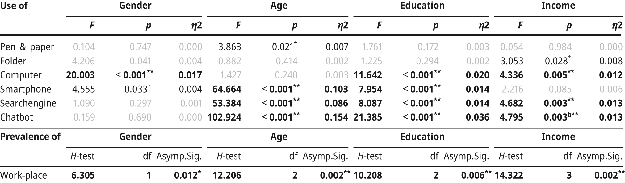 A further limitation is the lack of control over the conditions under which participants complete the questionnaire, including timing, setting, and self-reporting. Additionally, the presence of incentives might prompt some participants to respond fleetingly or inattentively. To address this, besides the panel provider’s quality checks, we also assessed the meaningfulness of responses to open-ended questions. Here, qualitative studies are able to overcome such biases. They have the advantage of an in-depth understanding of the context in which tools and locations are used, as well as understanding different scenarios and reasons, which a quantitative study cannot achieve. Previous qualitative studies, which have examined different working environments in specific cases, lack an overview of the population and its socio-demographic differences.