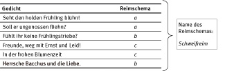 Reimspannung wird durch den Schweifreim aufgebaut und dann glücklich melodiös aufgelöst, was vor allem in der Schlusspointe, der Vertreibung des Weingottes und dem Küssen (Bacchus, weg! Ich will nun küssen, Z. 24), gipfelt: Hierin tritt der Witz als „formales Gestaltungsprinzip“ hervor (Alt 2001: 150). Typisch für die Anakreontik verdrängt der „unbeschwert-heitere Weltgenuss [...] melancholische [...] Umdüsterung“ (ebd.: 149). „Ernst und Leid“ (Z. 4) und „trübe Stirnen“ (Z. 18) gehen in der fröhlichen Frühlingsszenerie unter.