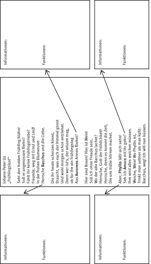 Die Sequenzanalyse nach Schönert et al. (2007) ermöglicht einen ersten strukturierten Zugriff auf die Informationsebene eines lyrischen Textes. Besonders gut anwendbar ist sie auf ältere Gedichte wie „Frühlingslust“, in denen Strophen oftmals inhaltliche Einheiten darstellen, die man als jeweils eigene Sequenzen bezeichnen kann. Für Goethes „Maifest“ müsste bei einer Sequenzanalyse dagegen berücksichtigt werden, dass die Strophen keine abgeschlossenen Einheiten mehr bilden, sondern fließend ineinander übergehen (zur Kritik an der Sequenzanalyse nach Schönert et al. vgl. Burdorf 2015: 215).