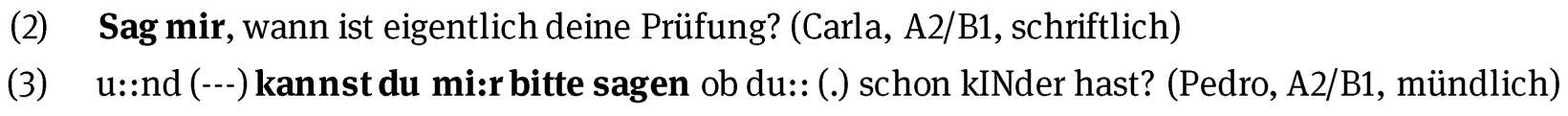 (3) u::nd (–-) kannst du mi:r bitte sagen ob du:: (.) schon kINder hast? (Pedro, A2/B1, mündlich)