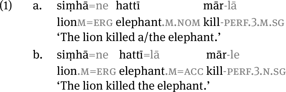 With respect to linguistic data, uncertainty is already present at stage ① of the visualization pipeline, since ambiguity and underspecification is an inherent part of language structure, with ambiguities found at both the token (word) level and higher phrasal levels. Languages also use systems of oppositions, whereby a marked form is contrasted with an unmarked one to signal a semantic effect, as for example in Differential Object Marking, shown below in Example (1) for Marathi. Here, the unmarked (nominative) object is unspecified for definiteness/specificity via the absence of marking. In the presence of overt (accusative) marking, the only available interpretation is that there is a particular elephant that was killed.