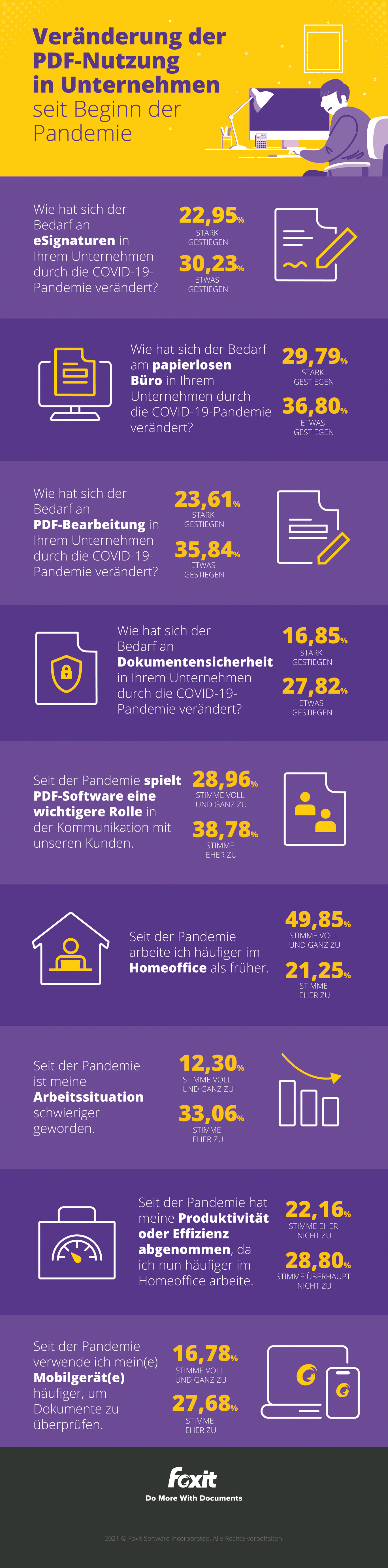 Die Befragten finden außerdem, dass sich die Pandemie nicht negativ auf ihre Arbeitsleistung ausgewirkt habe. Nur 18 Prozent sagten, dass ihre persönliche Produktivität abgenommen habe. Rund 71 Prozent gaben an, aufgrund der Pandemie häufiger zu Hause zu arbeiten. Die Nutzung von Papier war zwar bereits in vielen Unternehmen rückläufig, aber die Pandemie hat den allgemeinen Rückgang deutlich beschleunigt. PDF-Bearbeitung und verwandte Technologien wie E-Signatur-Lösungen sind für das Arbeiten und Führen von Geschäften unverzichtbar geworden. Für die Studie befragte Foxit Software 2.378 Geschäftsleute – darunter auch viele Kunden.