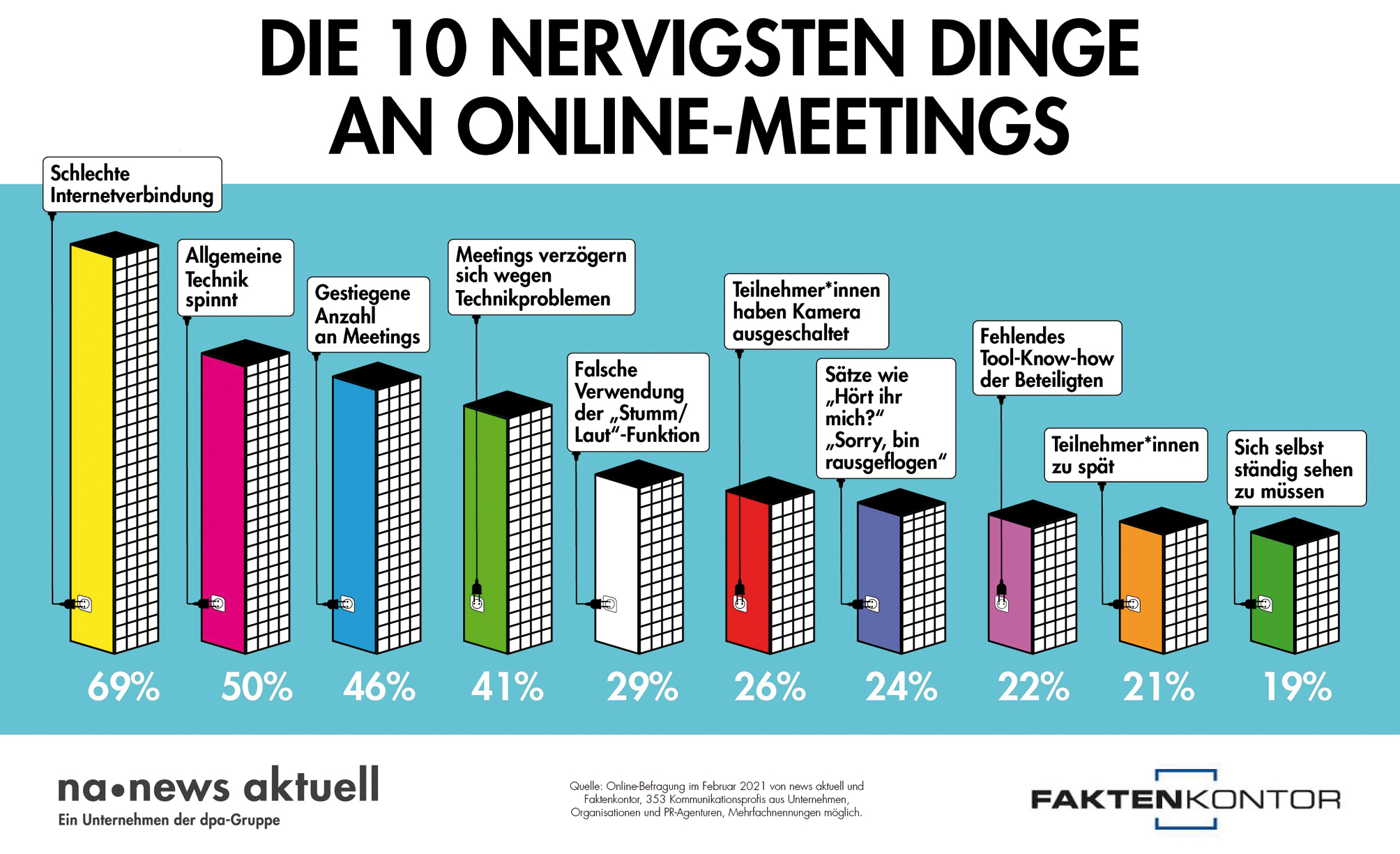 Dass die Bandbreite nicht reicht und es dadurch zu Verzögerungen oder Ausfällen während Online-Meetings kommt, nervt mit Abstand die meisten Befragten (69 Prozent). Jede/r zweite Kommunikationsverantwortliche (50 Prozent) regt sich am ehesten auf, wenn die Technik mal wieder spinnt, etwa, weil kein Bild oder kein Ton übertragen wird oder das Mikro nicht funktioniert. Wegen der Pandemie haben virtuelle Meetings stark zugenommen, was bei 46 Prozent der Befragten den größten Unmut erzeugt.