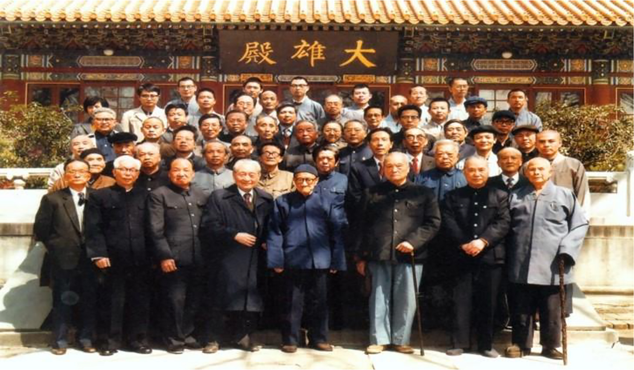 The picture shows all the members participating in the inaugural meeting taking a group photo in front of the Great Hall of Guangji Temple, Beijing.