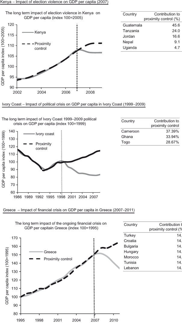In the paper we explore just how similar the growth trajectory of countries with similar exports is, and exploit this similarity to conduct counter-factual analysis. We find that a synthetic combination of a country’s most similar exporters often perfectly matches economic growth in the reference country over a long period of time. We call this method Proximity Controls and apply it to the case of Indonesia’s 1997 financial and political crisis. We also highlight applications to the cases of political instability in Ivory Coast, election violence in Kenya and Greece’s debt crisis.