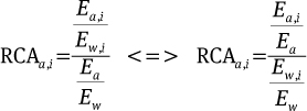 where RCAa,i is the revealed comparative advantage of country a in product i, Ea,i is total exports of country a in product i, Ew,i is total global export of product i, Ea is total exports of country a, and Ew total global exports. Basically what this formula measures is a country’s share of world exports of a specific product divided by its share of total world exports. A country is said to have a revealed comparative advantage in a certain product when its RCA in that product is >1, i.e., when the country’s share of world exports of that product is greater than the country’s share of global exports. This is the definition of revealed comparative advantage we use in this paper.