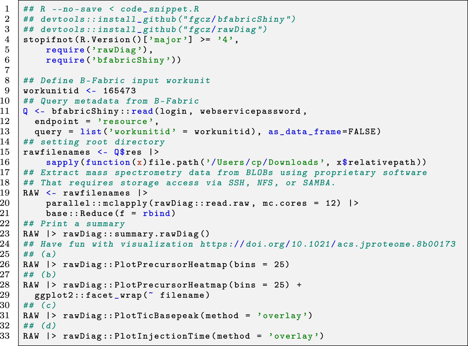 The second application example illustrates the interaction between an application (performing quality control) and the B-Fabric platform on the command line level using the R environment. On the one hand, it shows how a more programming skilled user can use the platform interface. On the other hand, it also demonstrates how a more complex visualization application can be implemented. Of note, the workflow consists of steps (3) and (4) only (see Figure 4). The depicted code snippet in Listing 3 requires an authentification configuration, saved in login and webservicepassword in line 11, which is used for accessing the B-Fabric platform.
