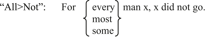 The results are shown in Figure 3. The numbers within the graph represent percentages. The dark bar represents the responses where only the “All > Not” picture was chosen, the middle part represents the responses where both the “All > Not” and “Not > All” pictures were chosen, and the light bar represents the responses where only the “Not > All” pictures were chosen.[8]