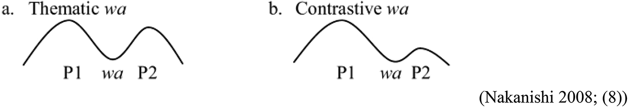 Japanese topic marker -wa has dual meanings; Thematic Topic (TT) -wa and Contrstive Topic -wa. The thematic -wa is characterized by having an intact pitch accent in the rest of the sentence (typically the predicate), as depicted in the following diagram by Nakanishi (2008). Since -wa is a topic marker, it can be attached to other elements than the subject of a sentence (e.g., object).