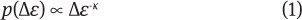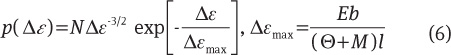 where N is a normalisation constant. The cut-off Δεmax is found to be inversely proportional to the system size l and to the sum of the intrinsic hardening coefficient Θ and a stiffness parameter M. The latter parameter governs the stress reduction in response to a plastic strain increment in conditions of displacement control; it is equal to zero in stress-controlled experiments and is equal to the elastic modulus E for displacement-controlled deformation with an ideally stiff machine. Relation (6) was first found in simulations of a stochastic microplasticity model by Zaiser and Nikitas [26], and the scaling Δεmax∼1/l was later confirmed for a generic dislocation-based model by Salman and Truskinovsky [27], as well as by discrete dislocation dynamics simulations [25].