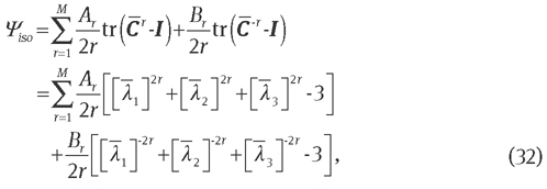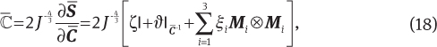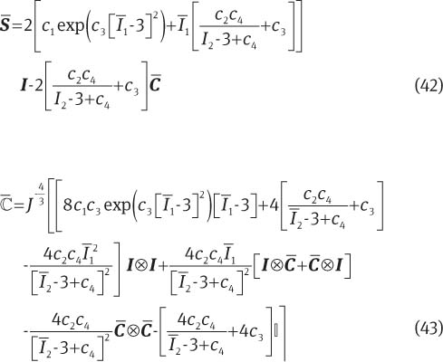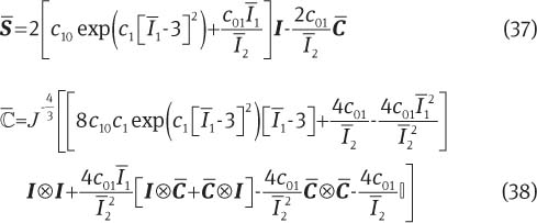 where cpq is a material parameter set and Ī1 and Ī2 are the first and second invariants of the isochoric right Cauchy-Green strain tensor, respectively. Similar to the decoupled representation of the energy function, the decoupled stress tensor has been utilized. Using the chain rule and after some algebraic manipulations, the fictitious stress tensor, tangent operator can be obtained from the invariant-based energy function, i.e., Eq. (10)