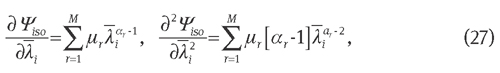 where μr and αr are the material parameters that have to satisfy the stability condition, i.e., μrαr>0. To derive the stress tensor and full tangent operator, the single and double differentiations of the Ogden energy function yield