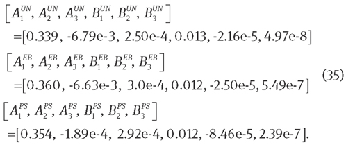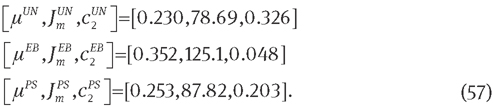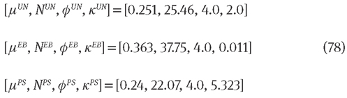 To evaluate the performance of this model, we simply take a three-term expansion in the energy function, i.e., M=3, which, according to certain authors [11, 13], is sufficient to reproduce the so-called characteristic S-shaped curve in rubber elasticity. By optimizing the UN, EB, and PS equations to the corresponding Treloar data, the optimal material parameters are found: