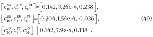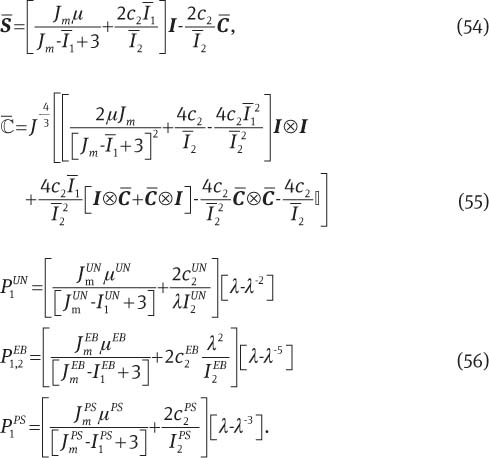 where c10, c1, and c01 are the material parameters. Evaluation of Eqs. (11), (12), and (23) provides the corresponding fictitious stress tensor, tangent operator, and the analytical formulations for UN, EB, and PS, respectively: