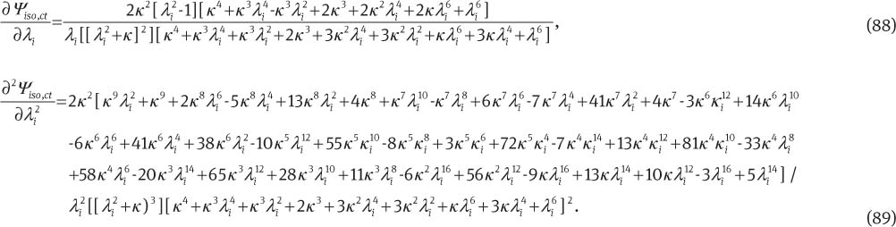 In Eqs. (17) and (18), the eigen bases Mi with the coefficients Di can be obtained as derived by Miehe [19]. In the case of equal eigenvalues, the perturbation approach as demonstrated by Miehe [19] or Ogden [39] has to be used. One of the salient features of the above-mentioned compact algorithmic formulations is that, to compute all coefficients appearing in Eqs. (19)–(22) necessary for the full tangent operator derivation in Eq. (18), only the first and second derivatives of the energy function wrt the principal stretches, i.e.,
