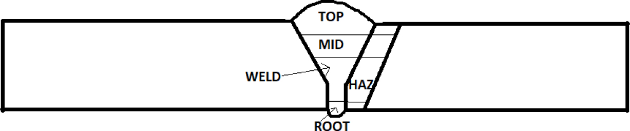 From the microhardness survey, it is understood that weldment consists of five distinct regions (i) Weld Metal, (ii) CGHAZ (iii) FGHAZ (iv) ICHAZ, (v) BM.