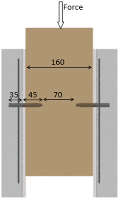 The elasticity modulus of wood in bending (E m,g) is determined following the recommendations of Standard EN408:1995 [29]. The elasticity modulus is obtained with standardized wooden specimens without defects measuring 2 cm × 2 cm × 30 cm subjected to 4-point bending tests (Table 1).