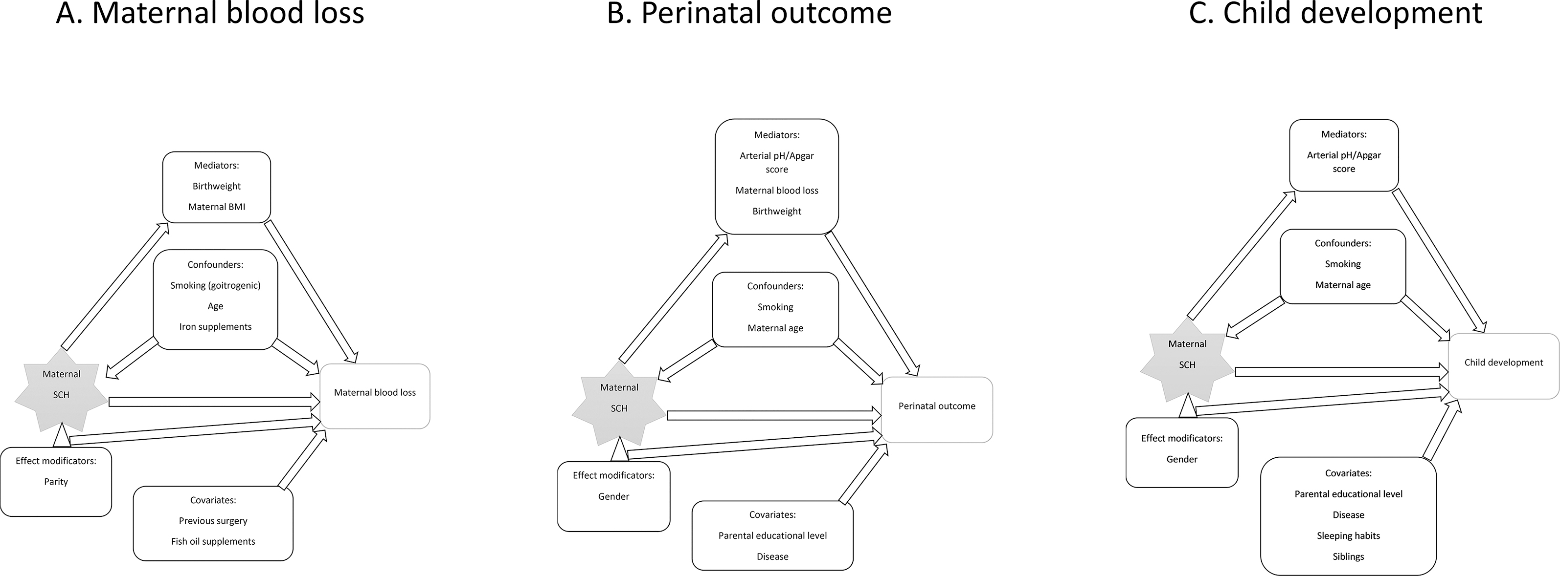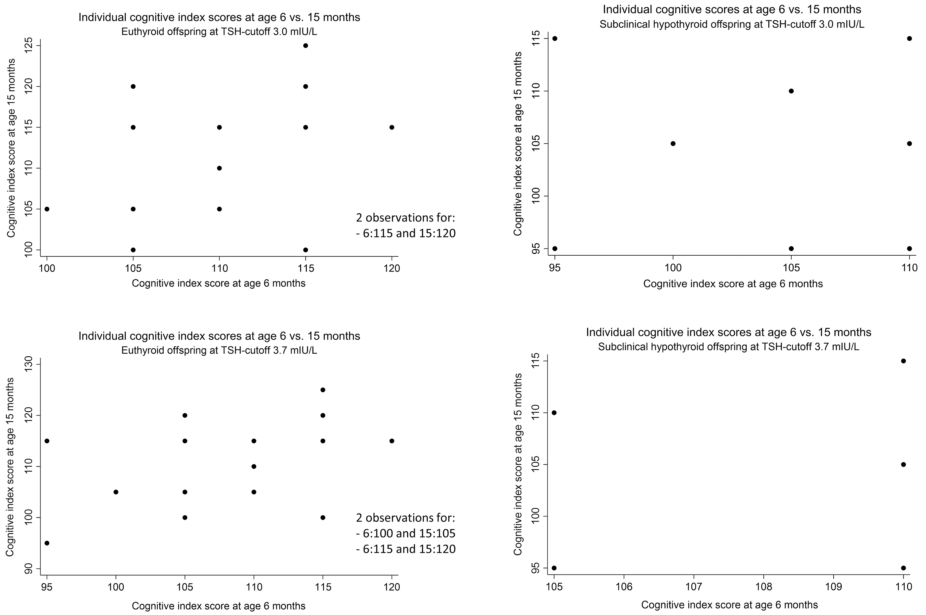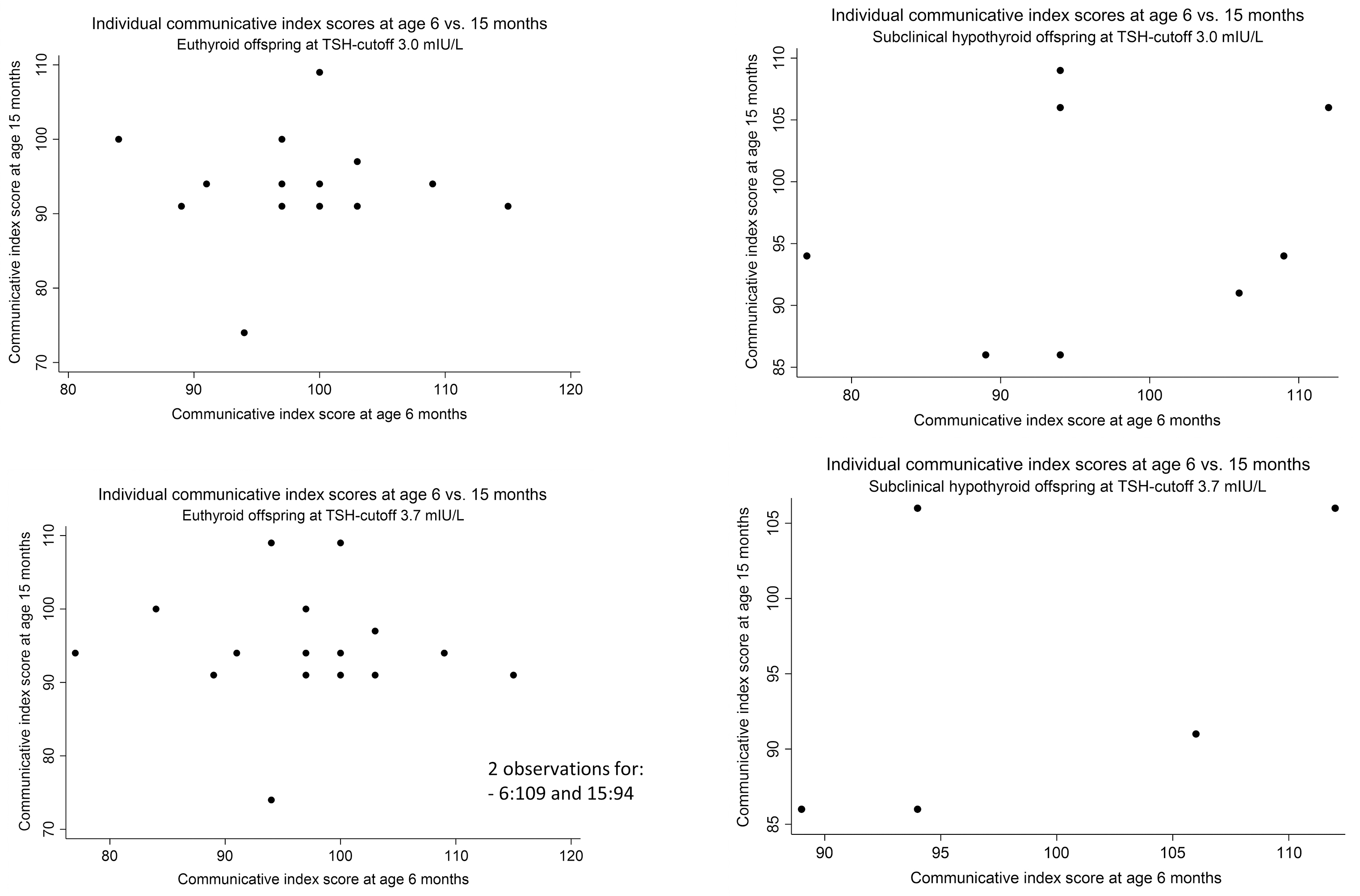 An observational study with 77 singleton-pregnant women included by thyroid screening before a planned cesarean section. Two TSH-cutoffs (3.0 and 3.7 mIU/L) defined euthyroid and SCH groups, and were applied to evaluate offspring anthropometrics, complication rates (maternal blood loss, Apgar-score, cord arterial-pH, admission to neonatal intensive care unit, perinatal hypoglycemia) and offspring development. Development was evaluated by Bayley-III test in a subsample at age 6 months (n=27) and 15 months (n=22).