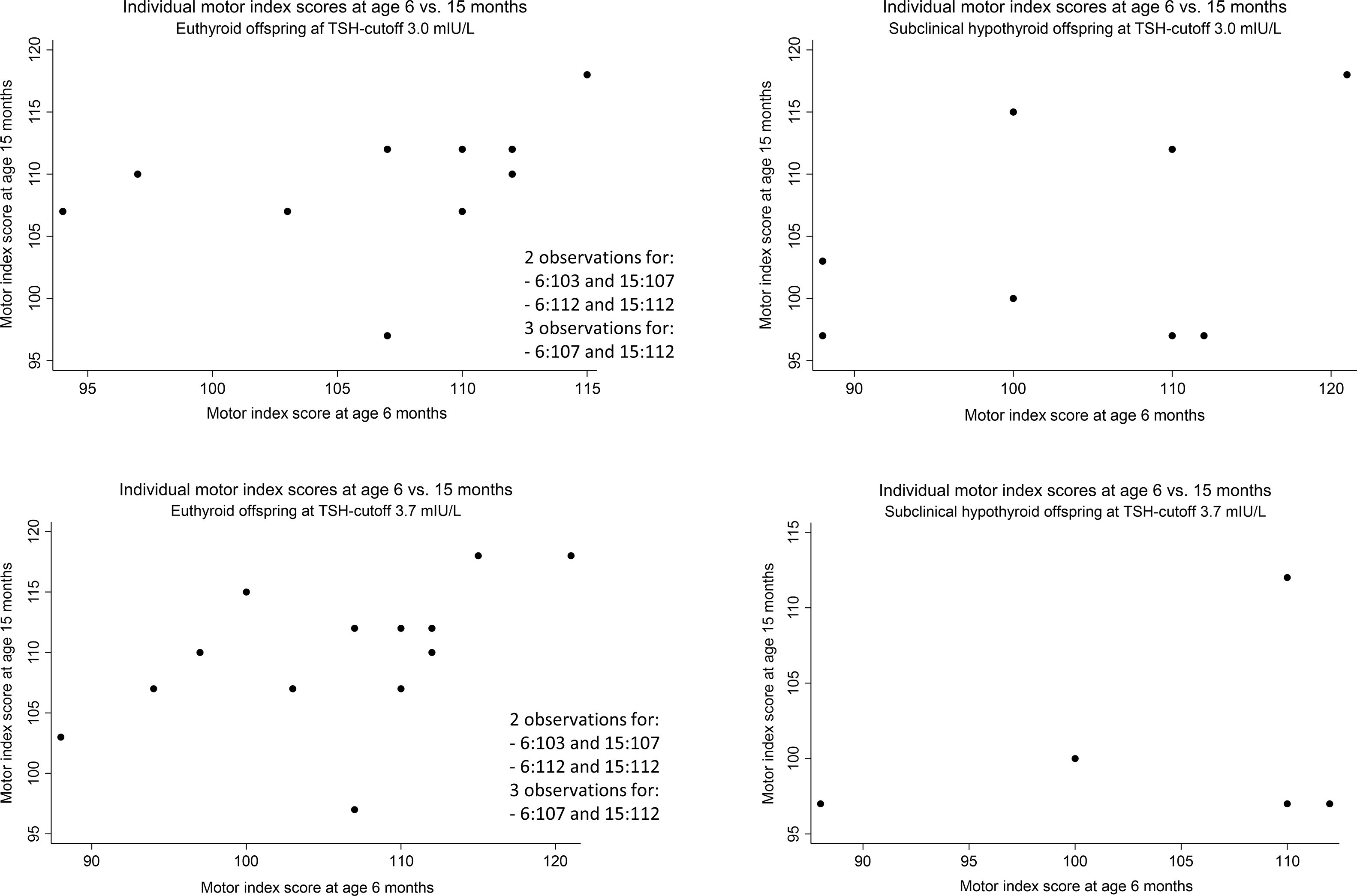 Prevalence of SCH was 31.2 % at TSH-cutoff 3.0 mIU/L, and 16.9 % at TSH-cutoff 3.7 mIU/L. No differences in complications and anthropometrics were observed. In Bayley-III tests, cognitive score was decreased at 6 months (p=0.012) and at 15 months (p=0.056) by applying TSH-cutoff 3.0 mIU/L. At cutoff 3.7 mIU/L, motor score was decreased at 15 months (p=0.020). Male offspring had significantly lower cognitive scores at age 6 and 15 months (TSH-cutoff 3.0 mIU/L), and motor scores at age 15 months (TSH-cutoff 3.7 mIU/L).