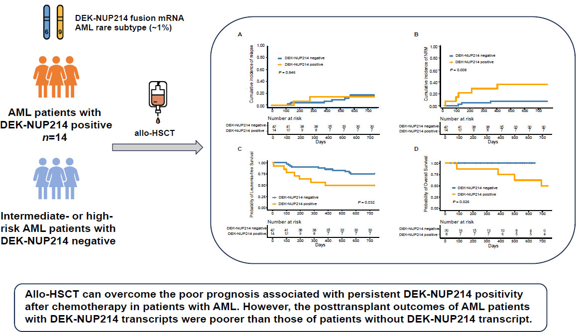 Thus, this retrospective, multicentre study aimed to evaluate the dynamic evolution of DEK-NUP214 transcripts before and after allo-HSCT as well as the impact of pretransplant DEK-NUP214 status on posttransplant outcomes in AML patients.