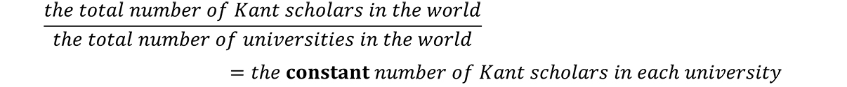 The left-hand side of the equation simply yields the notion of an average. It tells us how many Kant scholars, on average, are in each university. In addition, the assumption of uniformity informs us that this average, no matter how big or small, is precisely the number of Kant scholars we will find in each university. If one university held even one more or less than the average, the distribution could not be called uniform. Also, if I average over two, three or rather a hundred universities, the average, being equal to the number of scholars in each university, will not change. The constant number of Kant scholars in each university indicates that such a number is not a function of, or in any way dependent on, the specific university that we might deliberately choose.