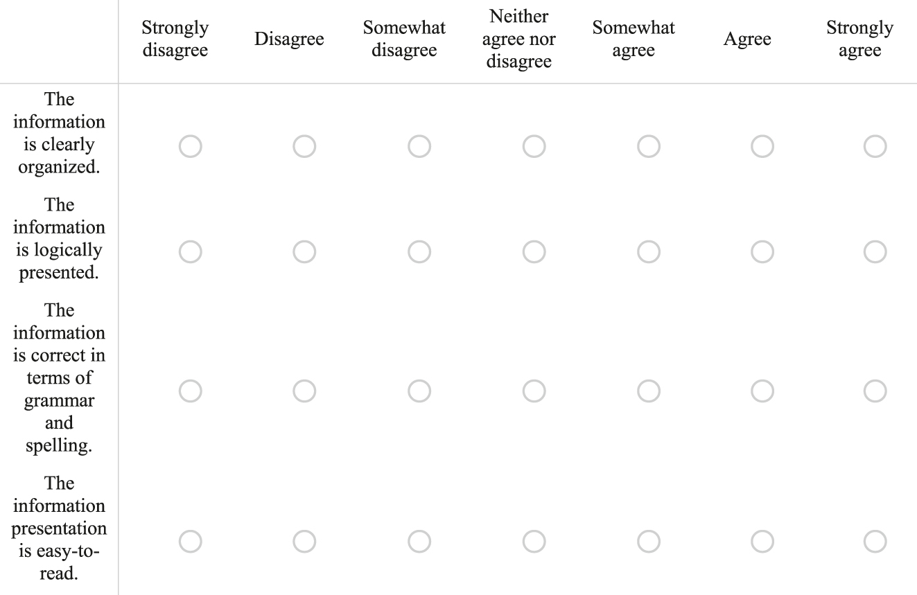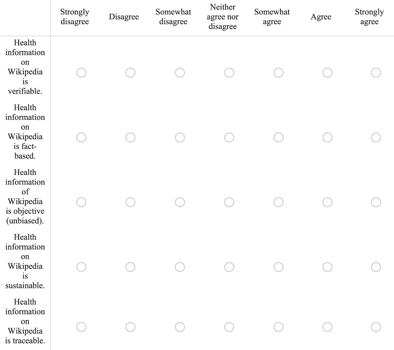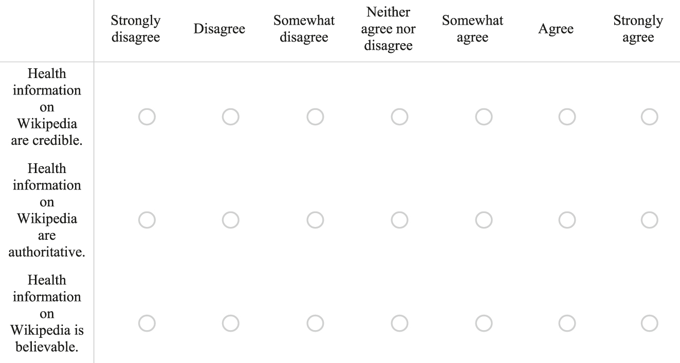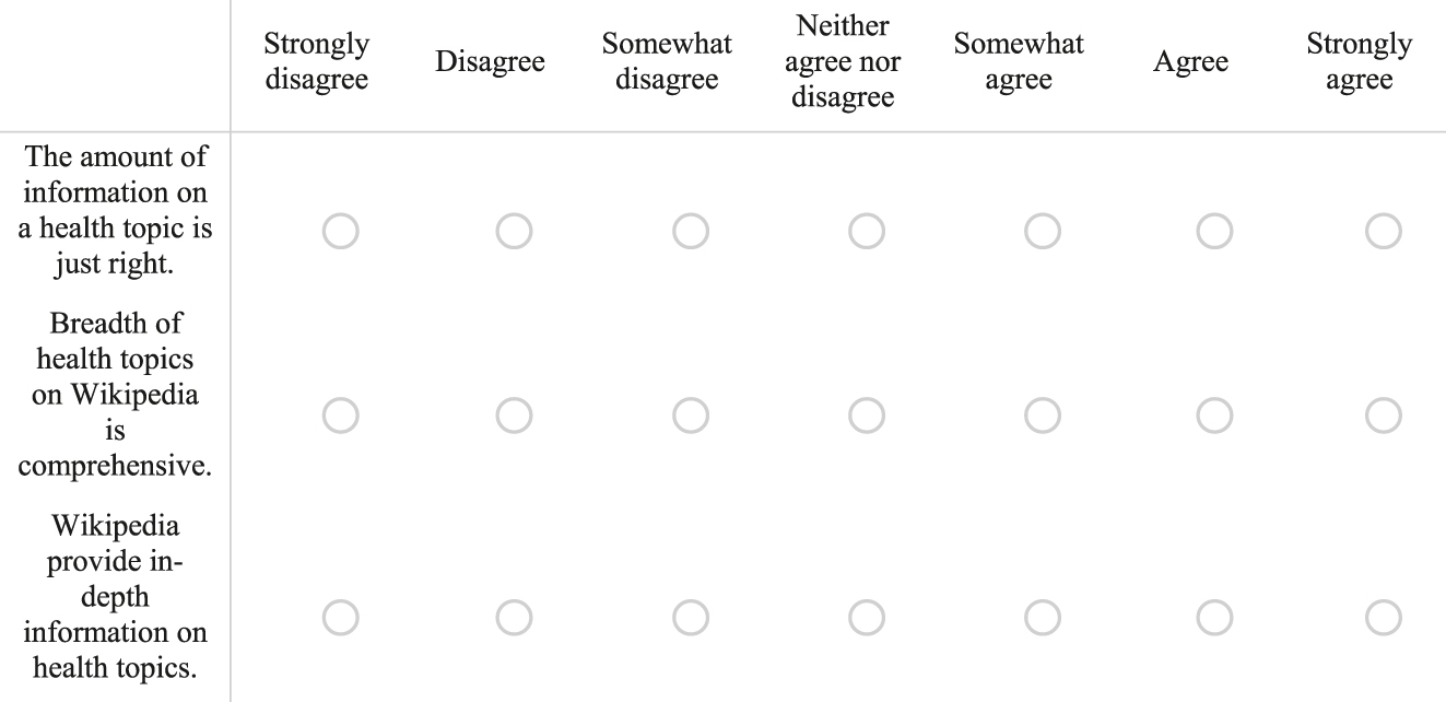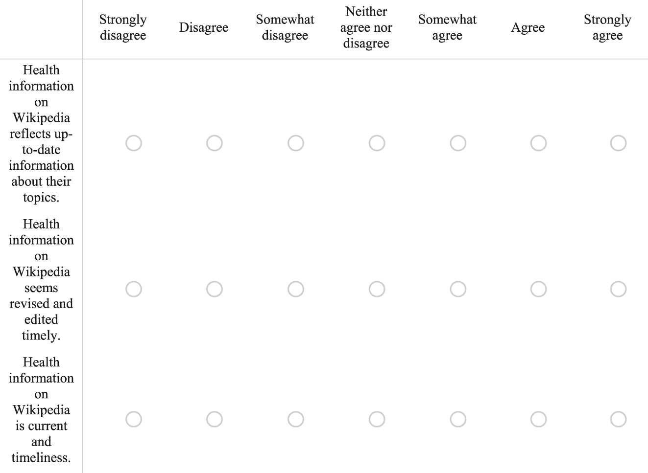 The following five measures for this study were drawn from prior research (Koo et al. 2011; Stvilia et al. 2009; Wang and Strong 1996) and adapted for this study (Figure A1). A total of eighteen items were used in the data collection and analysis, excluding demographic questions. Participants were asked to rate information quality factors on a 7-point Likert scale ranging from 1 (strongly disagree) to 7 (strongly agree). We measured participants’ perceptions of the level of Trustworthiness using three items: “health information on Wikipedia is credible”; “health information on Wikipedia is authoritative”; and “health information on Wikipedia is believable.” Participants’ perceptions of Reliability were assessed by five items: “health information on Wikipedia is verifiable”; “health information on Wikipedia is fact-based”; “health information of Wikipedia is objective (unbiased)”; “health information on Wikipedia is sustainable”; and “health information on Wikipedia is traceable.” We measured the perceived Currency using three items: “health information on Wikipedia reflects up-to-date information about their topics”; “health information on Wikipedia is revised and edited timely”; and “health information on Wikipedia is current and timeliness” (exact terms used in the study). Topic Coverage was measured with three items: “the amount of information on a health topic is just right”; “the breadth of health topics on Wikipedia is comprehensive”; and “Wikipedia provides in-depth information on health topics.” Information Presentation was assessed with four items: “the information is clearly organized”; “the information is logically presented”; “the information is correct in terms of grammar and spelling”; and “the information presentation is easy to read.”