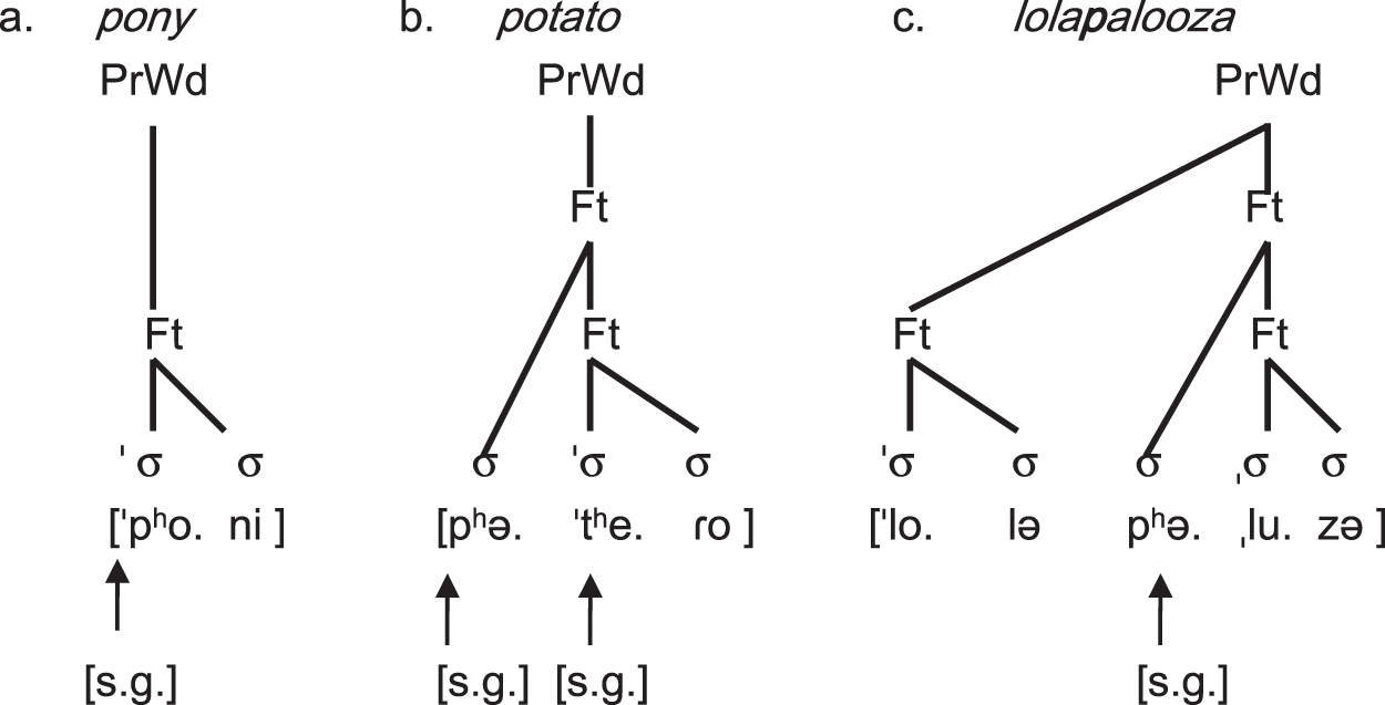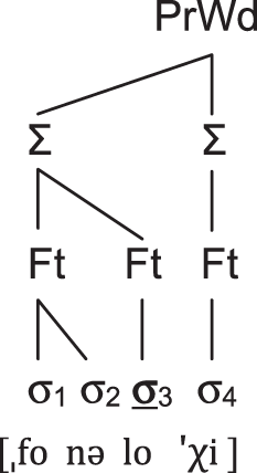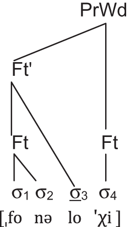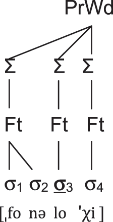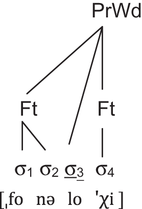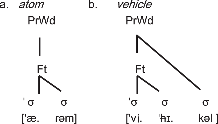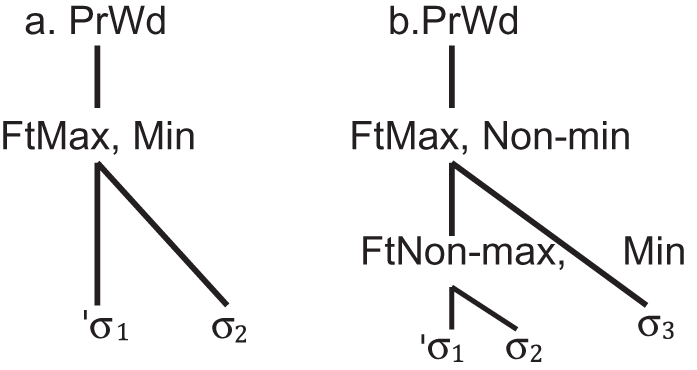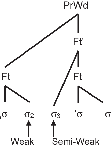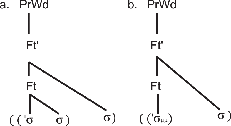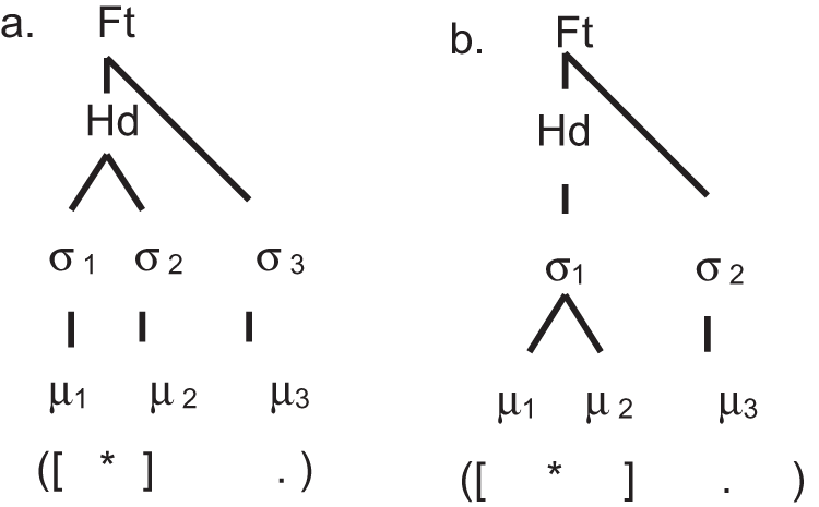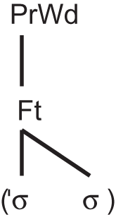 In metrical theory and prosodic hierarchy theory, the category “foot” has traditionally been assumed to be: (i) maximally disyllabic and (ii) universally immediately dominated by the prosodic word (e.g., Nespor and Vogel 1986; McCarthy and Prince 1996 [1986]; Hayes 1995) (throughout the paper, headedness is indicated with vertical lines, parentheses signal foot boundaries and “σ” denotes syllables):
