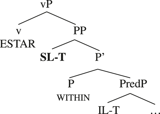 Most studies on the distribution of Spanish ser and estar focus on ‘adjective + copula’ constructions, and to a lesser extent on passive constructions. In this line, most theoretical approaches that try to explain the contrast in (1) through aspectual information related to the Individual-Level versus Stage-Level distinction or the contrast between perfectivity and imperfectivity (Arche 2006; Carlson 1977; De Miguel 1992; Fernández Leborans 1999; Leonetti 1994; Luján 1981; Milsark 1974; Roby 2009; Romero 2009; see Fábregas 2012; Leonetti et al. 2015 for an overview). Lately, this aspectual distinction has been operationalized through the dichotomy between central versus terminal coincidence prepositions contained within the complement of the copulative verb (Brucart 2012; Gallego and Uriagereka 2016; see also Camacho 2012 for a related approach that stems from Hale 1986 and its application to Spanish in Mateu 2002).