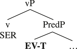 However, the view in which ser is a default copula faces problems when one considers locative contexts because in such cases ser seems to be positively specified for events. As we will see in this section, ser combines with events, and estar combines ‘by default’ with anything else. Taken at face value, this goes against an approach in which ser is the elsewhere copula, and estar is specified for some type, as in (7).