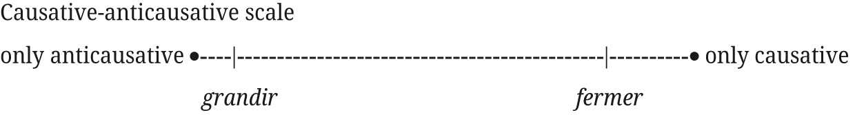 We can thus locate alternating verbs on a causative-anticausative scale that represents the proportion between the causative and the anticausative use of a verb. Grandir is located towards the anticausative end and fermer towards the causative end of the scale, as represented in (3).
