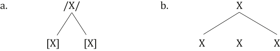 Multiple levels of analysis are ubiquitous in phonology, both in description and in theory. For the moment it will suffice to observe that this is patently true, and I return to the question of why in Section 5.4. Multiple levels can take the form of distinct representations, such as phones, phonemes and morphophonemes (Trubetzkoy 1969), or complex representations with multiple hierarchical layers, such as Pike’s (1947) hierarchical relationship of phonemes and segments as in (11a). Complex, hierarchical representations are convenient for capturing one-to-many correspondences, and perhaps one-to-zero correspondences if the formalism permits floating or unassociated elements as in (11b). Multiple, distinct representations can also capture these relationships and, depending on one’s assumptions, are potentially more tolerant of linear re-orderings.