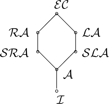 where 𝓔𝓒 is the class of EC-semigroups (that is, semigroups whose idempotents commute), for EC-semigroups, see [19, 20]; 𝓱𝓡𝓐 is the class of strict RA semigroups; 𝓱𝓛𝓐 is the class of strict LA semigroups; 𝓐 is the class of ample semigroups; 𝓘 is the class of inverse semigroups, and the symbolic “|” means that the upper class of semigroups includes properly the lower one.