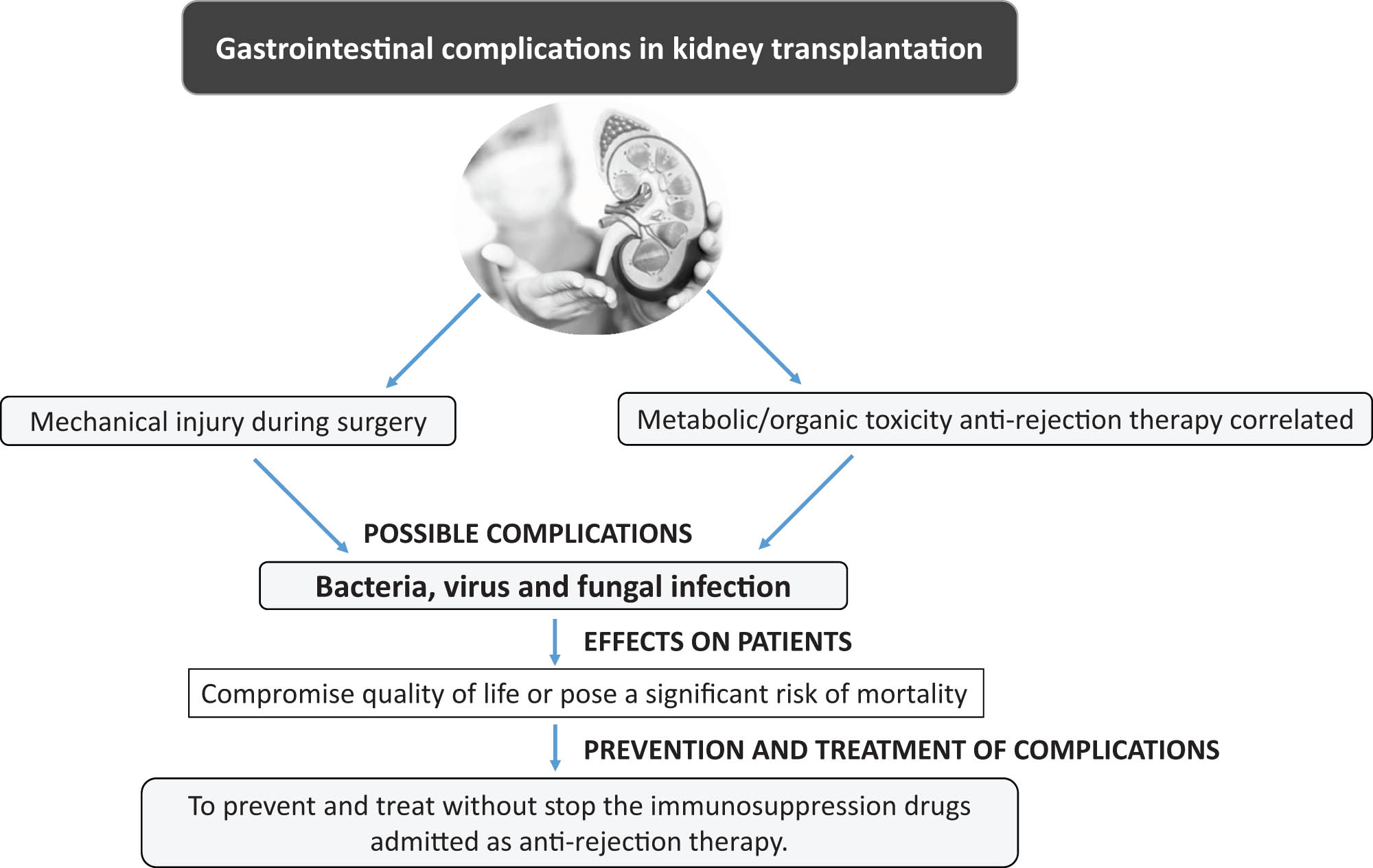Kidney transplantation is the surgical operation by which one of the two original kidneys is replaced with another healthy one donated by a compatible individual. In most cases, donors are recently deceased. There is the possibility of withdrawing a kidney from a consenting living subject. Usually, living donors are direct family members, but they could be volunteers completely unrelated to the recipient. A much-feared complication in case of kidney transplantation is the appearance of infections. These tend to arise due to immune-suppressor drugs administered as anti-rejection therapy. In this review, we describe the gastrointestinal complications that can occur in subjects undergoing renal transplantation associated with secondary pathogenic microorganisms or due to mechanical injury during surgery or to metabolic or organic toxicity correlated to anti-rejection therapy. Some of these complications may compromise the quality of life or pose a significant risk of mortality; fortunately, many of them can be prevented and treated without the stopping the immunosuppression, thus avoiding the patient being exposed to the risk of rejection episodes.