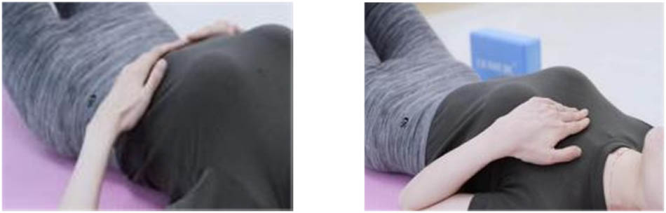 While in a supine position, with knees bent and hands resting at their sides, patients employed the transverse breathing technique throughout the exercise. The procedure involved two key movements: (1) inhalation prompted a forward tilt of the pelvis, while exhalation involved tilting it backward. (2) Inhalation entailed rotating the pelvis to the right, followed by a return to a neutral position upon exhalation, and then a rotation to the left with the next inhalation. Each exercise set consisted of eight repetitions, with a total of three sets executed and a 2-min rest interval between sets.